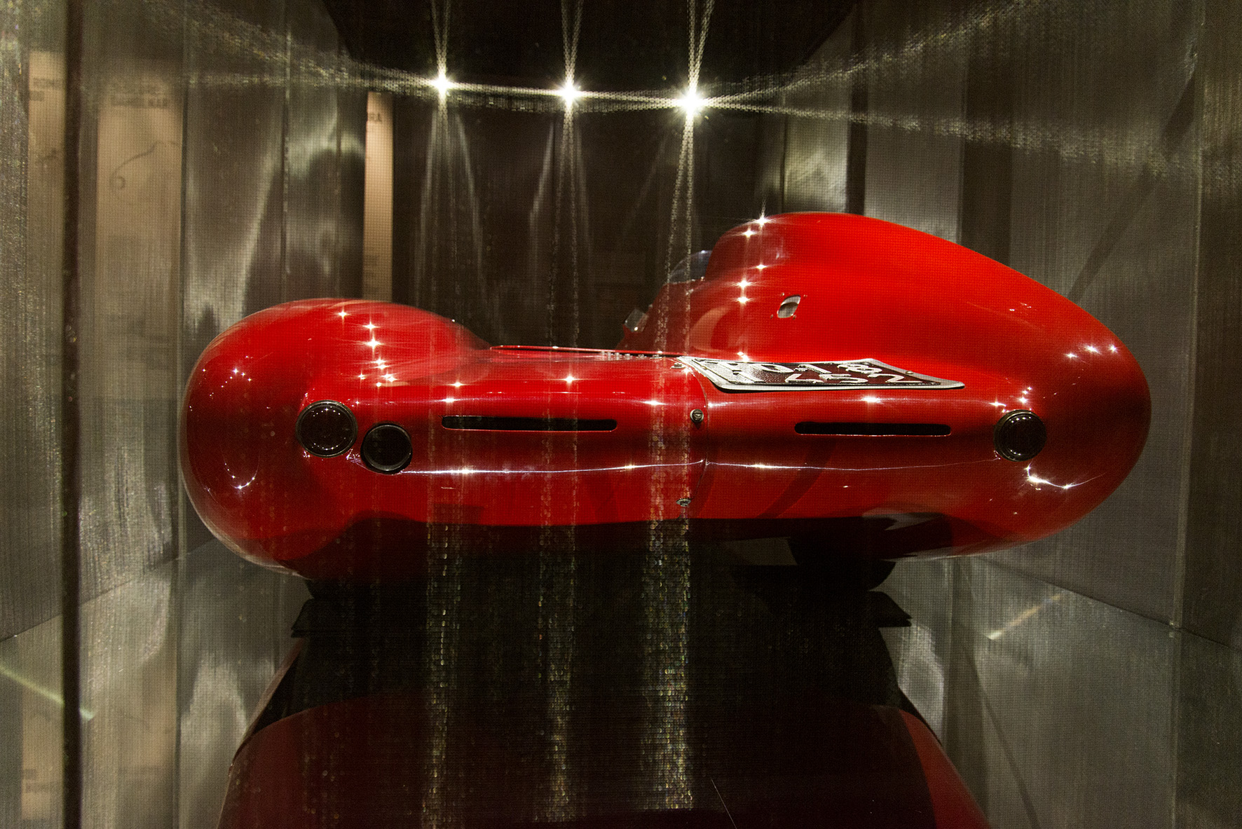 Nell’allestimento di questa sezione del Museo gli architetti hanno pensato di creare un involucro metallico, che è anch’esso un tessuto fatto su misura, un vestito che peraltro soddisfa la nostra esigenza di avere un elevato grado di sicurezza, anche perché le auto esposte sono così belle che viene voglia di toccarle. 400.000 visitatori che entrano nel Museo e le toccano finiscono per creare un danno.