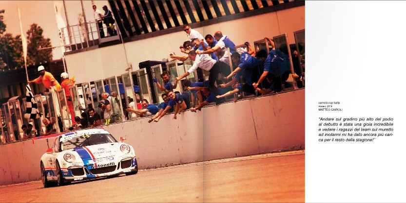 DEDICATO A PORSCHE ha una particolarità: va sfogliato e poi letto. Ci sono diversi piani di narrazione che si intrecciano, al punto che anche chi scorre le pagine diventa protagonista inconsapevole di un racconto che scatena percezioni diverse, che vanno oltre la gioia per la vittoria o la delusione per la sconfitta.
